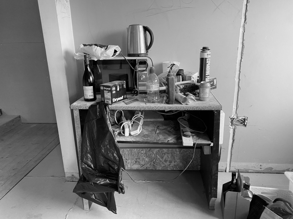 “Yep,” I repeat. In the hope of not being perceived as a total imbecile upon first acquaintance, I add: “All we have in there at the moment is a toilet and a sink. No kitchen. No hot water.”