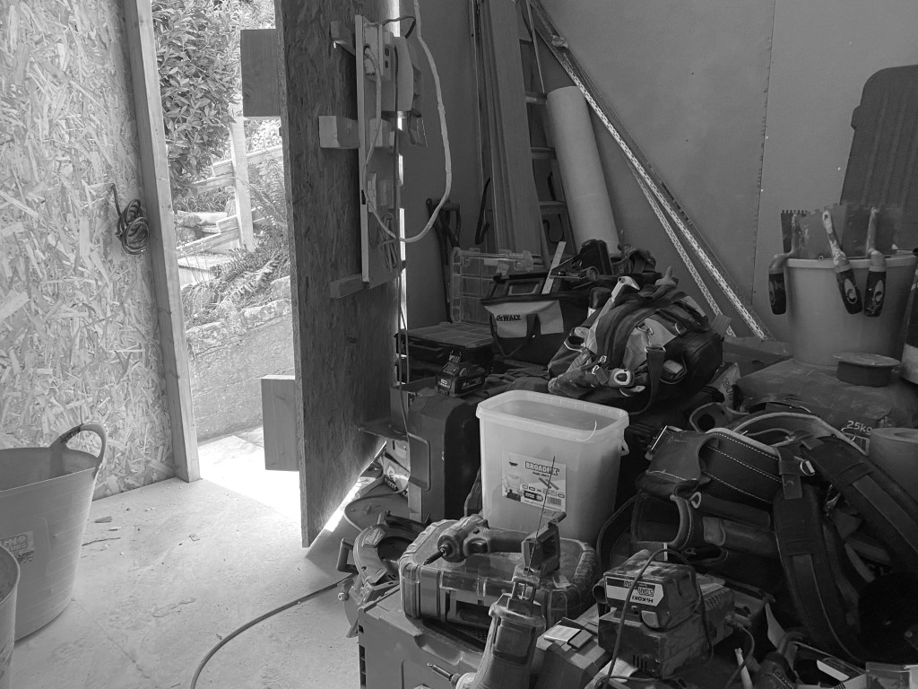 All of this is made even more testing by the fact that, currently, there is just one place to access the building. Naturally, this happens to be on the opposite side of the property to where the storage sheds are located. In addition, this makeshift, plywood door can only be locked from the outside. Therefore, if we want speedy access to the sheds, or need to lock said temporary door at the end of the evening, one of us having to clamber, effing and jeffing, in or out of the bedroom window.